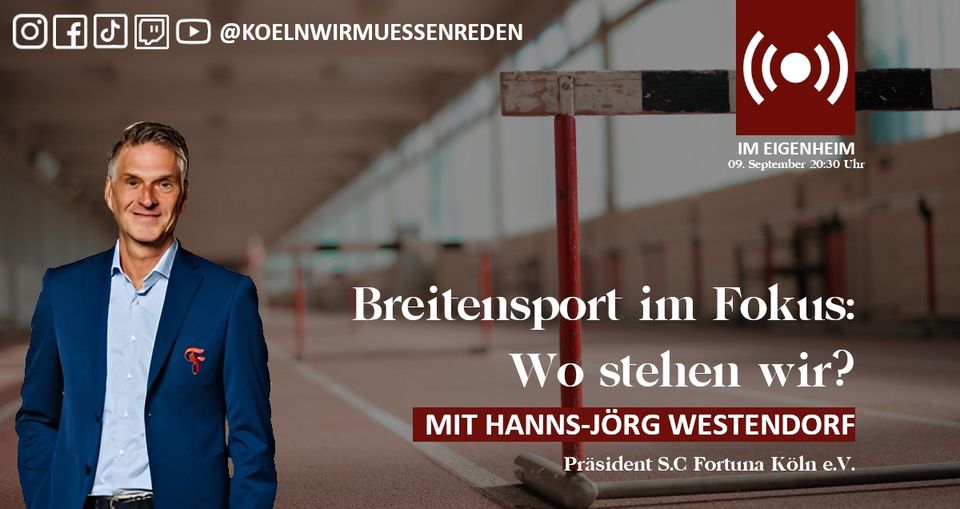 Dazu begrüßen wir Hanns-Jörg Westendorf, Präsident S.C. Fortuna Köln e.V., dessen Fortuna schon seit 10 Jahren um Verbesserungen der Infrastruktur im Jean-Löring-Sportpark kämpft. Wir diskutieren mit ihm über die nötigen Maßnahmen, um den Breitensport attraktiver zu gestalten und Kölns Sportlandschaft nachhaltig zu verbessern.